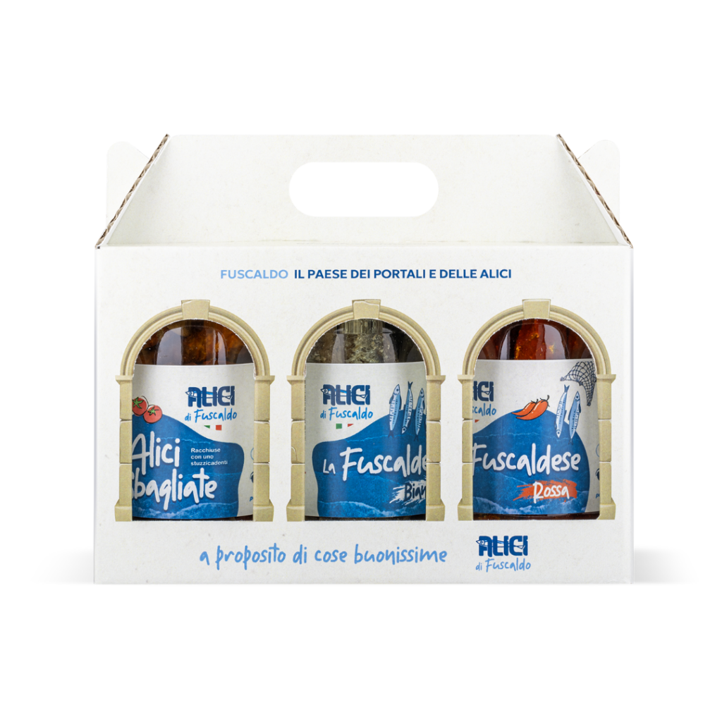 Le Alici di Fuscaldo sono una tradizione che si rinnova, racchiuse in un raffinato packaging che racconta la storia del "Paese dei Portali". Un tris regalo che porta con sé l'autenticità dei sapori marini e la qualità dei nostri prodotti.
